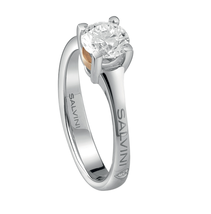 Anello interamente in oro 18kt. misura N13 con diamante centrale 0.20 F color . Questo gioiello fa parte della collezione Battito Di Casa Salvini Gioielli.